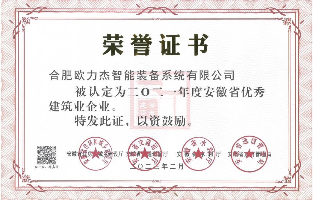 熱烈祝賀合肥歐力杰智能裝備系統(tǒng)有限公司榮獲2021年度安徽省優(yōu)秀建筑業(yè)企業(yè)。該榮譽(yù)由安徽省住房和建設(shè)廳、安徽省交通運(yùn)輸廳、安徽省水利廳、安徽省通訊管理局四部門于2023年2月統(tǒng)一評(píng)選認(rèn)定。