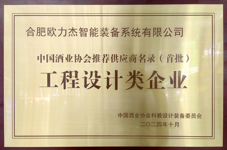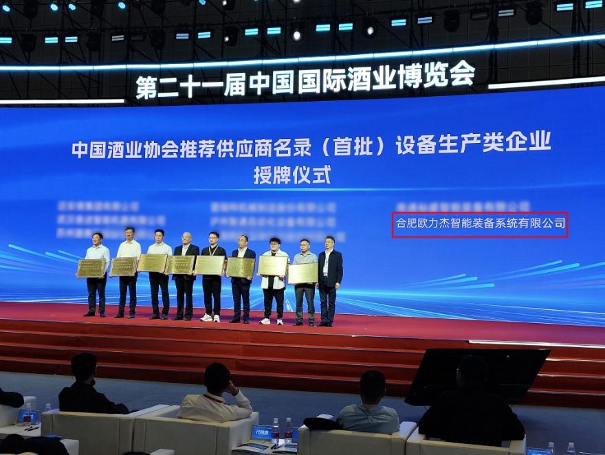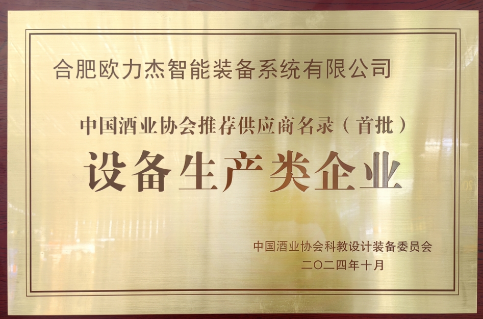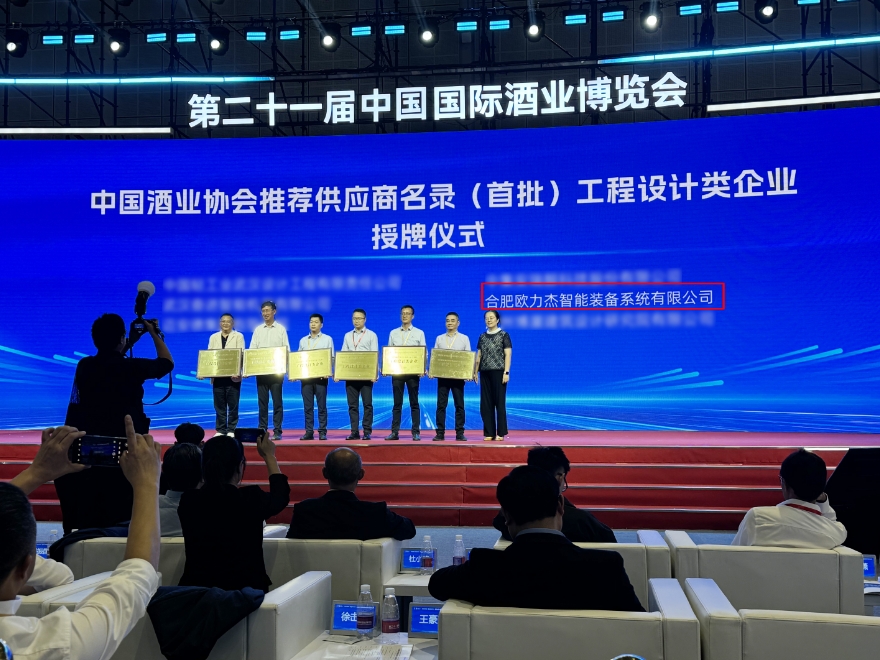 合肥歐力杰智能裝備系統(tǒng)有限公司榮膺“中國(guó)酒業(yè)協(xié)會(huì)推薦供應(yīng)商(首批)工程設(shè)計(jì)和設(shè)備生產(chǎn)類企業(yè)”雙項(xiàng)殊榮